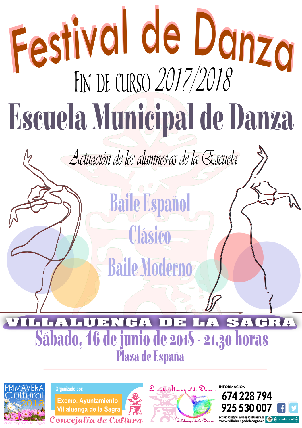 El sábado 16 de junio de 2018, desde las 21.30 horas, la Escuela Municipal de Danza celebrará el tradicional Festival de Danza Fin de Curso en la Plaza de España.