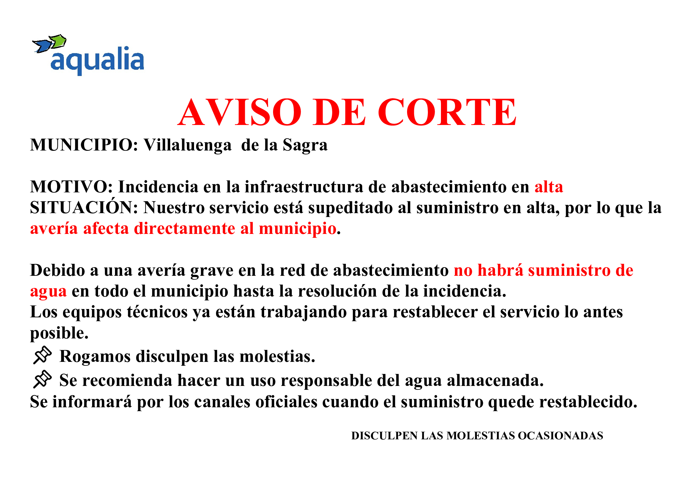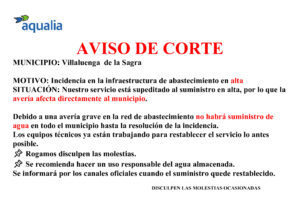 Desde AQUALIA nos informan que, debido a una incidencia grave en la infraestructura del sistema de abastecimiento de agua en alta (fase primera de abastecimiento, la que trae el agua desde el embalse de Picadas a Villaluenga), no será posible garantizar el suministro de agua en nuestro municipio.