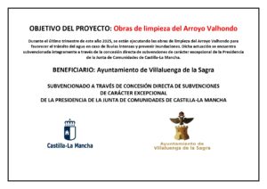 Durante el último trimestre de este año 2025, se están ejecutando las obras de limpieza del Arroyo Valhondo para favorecer el tránsito del agua en caso de lluvias intensas y prevenir inundaciones. Dicha actuación se encuentra subvencionada íntegramente a través de la concesión directa de subvenciones de carácter excepcional de la Presidencia de la Junta de Comunidades de Castilla-La Mancha.
